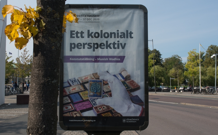 I arrived at the museum for a two-week install process in September with a feeling of empowerment and excitement over bringing the installation to life following eight months of work. A short walk into Jönköping centre later that evening robbed me of any power I had felt as I became emotionally paralysed by large, illuminated posters with the title “Ett kolonialt perspektiv, konstutställning av Munish Wadhia”10 and an image of a hand in a white glove inspecting Indian matchboxes.