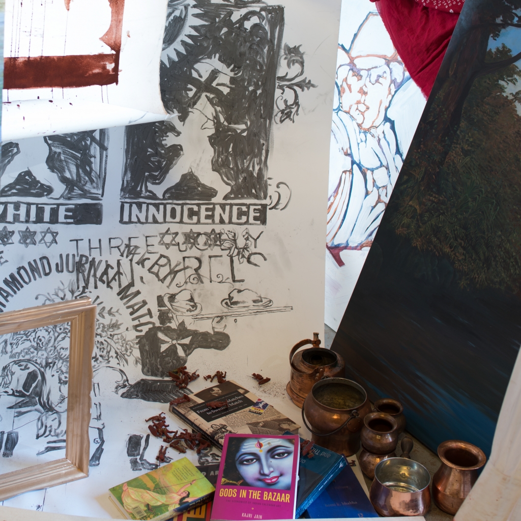 The artist Ravi Varma is renowned for his paintings of mythological tales with realistic depictions of Hindu gods. His use of the academic style, championed by the colonisers, performs what Christopher Pinney calls a “Sly Civility”2 appeasing the civilising mission at the same time as subverting the pictorial narrative into an anti-colonial resistance. In my artistic practice I use references embedded in these prints strategically to speak about my personal and private history and navigate the westernised gaze by dislocating the pictorial and symbolic elements. My work appears as landscape paintings and large-scale painterly installations bringing the exotic foreign and familiar into a shared proximity where the margins of difference become blurred.